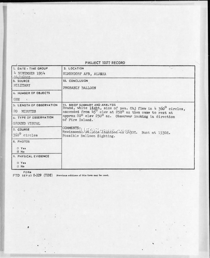 Project 10073 Record: Sighting at Elmendorf AFB, Alaska, 4 November 1954