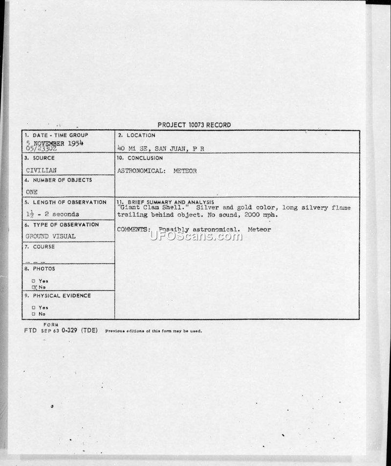 A sighting of a 'giant clam shell' shaped object near San Juan, Puerto Rico, on 5 November 1954 was investigated by the USAF. The object was officially concluded to be a meteor.