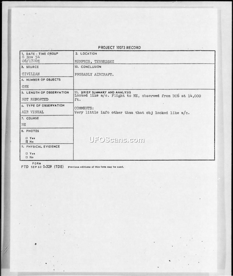 Project 10073 Record — Memphis, Tennessee, 6 November 1954