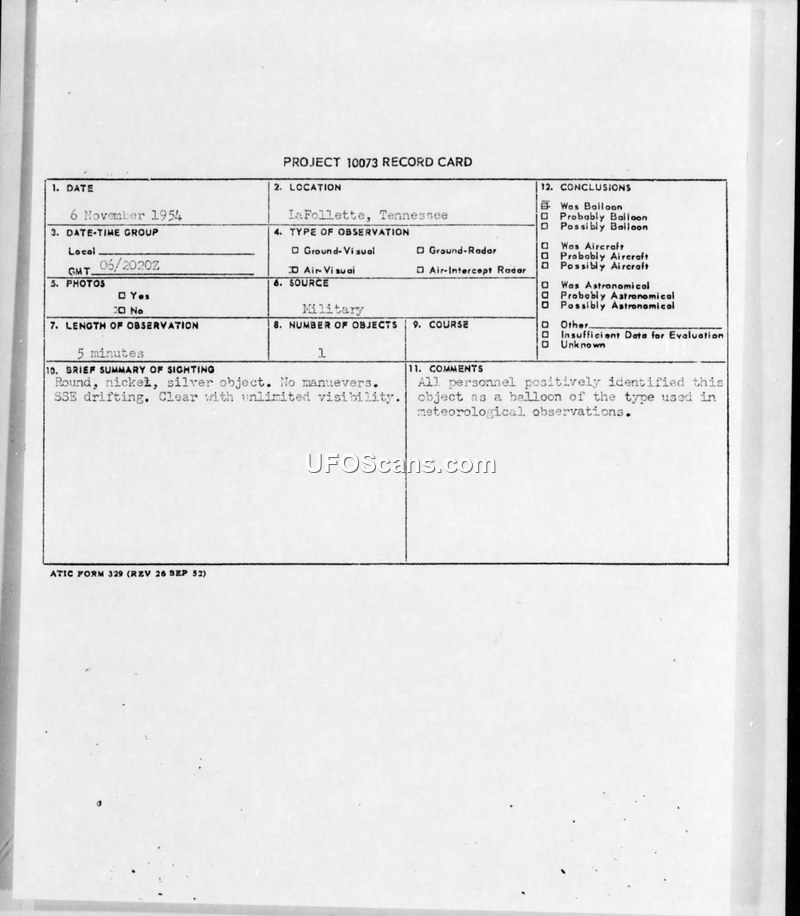 On 6 November 1954, at 2020Z, an Air Defense Alert Crew consisting of Captain Karl S. Payne, 1st Lieutenant Melvin C. Bowen, and 2nd Lieutenant Mark J. Stubber of the 469th Fighter Interceptor Squadron observed an unidentified object over LaFollette, Tennessee. The object was described as round, nickel, and silver in color, drifting in a south-southeast direction with no observed maneuvers. The observation lasted for approximately five minutes under conditions of clear, unlimited visibility. The pilots were vectored to the object by Air Defense Command radar. Following the encounter, the Intelligence Officer of the 460th Fighter Interceptor Squadron conducted an assessment of the incident. It was concluded that the object was a 100-gram meteorological balloon that had been released earlier that day at 1500Z. The report emphasizes that the pilots, who observed the object from 36,000 feet, positively identified it as a meteorological balloon, and the intelligence assessment found no reason to doubt this identification, citing the drift characteristics and the reliability of the witnesses.