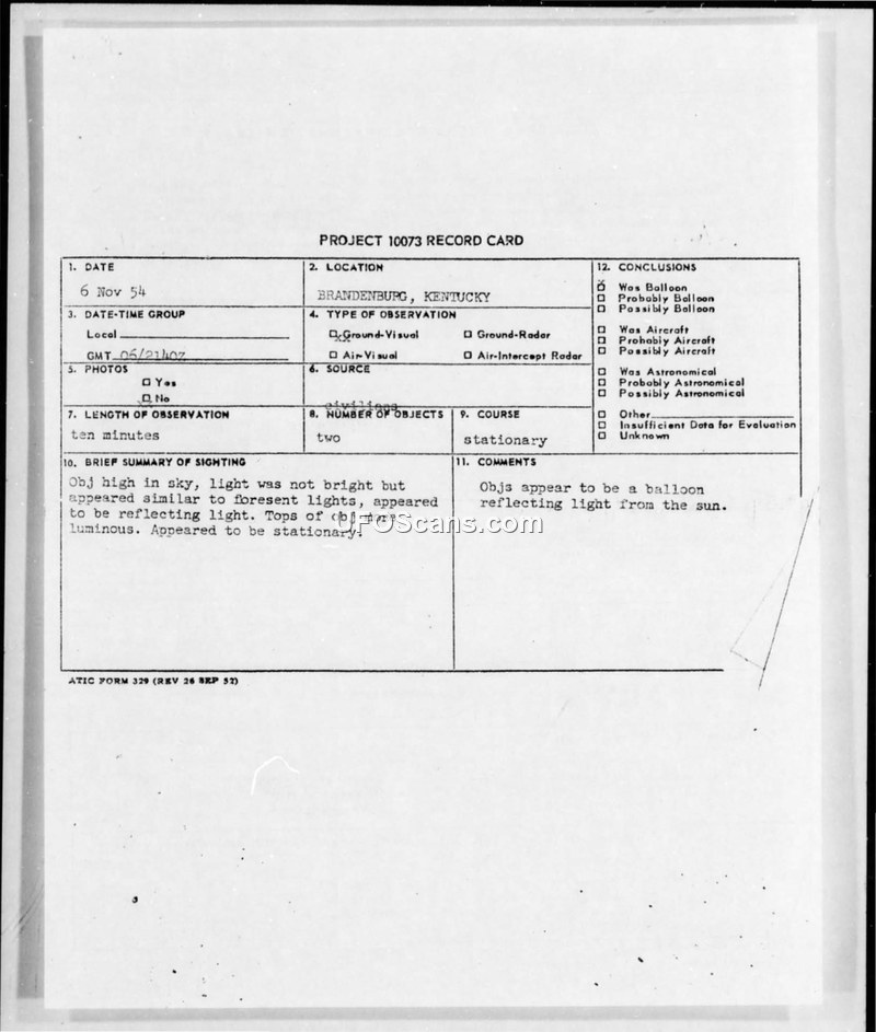 On November 6, 1954, a witness near Brandenburg, Kentucky, observed two stationary, luminous, white, column-like objects in the sky for ten minutes. The U.S. Air Force officially concluded the objects were balloons reflecting sunlight.