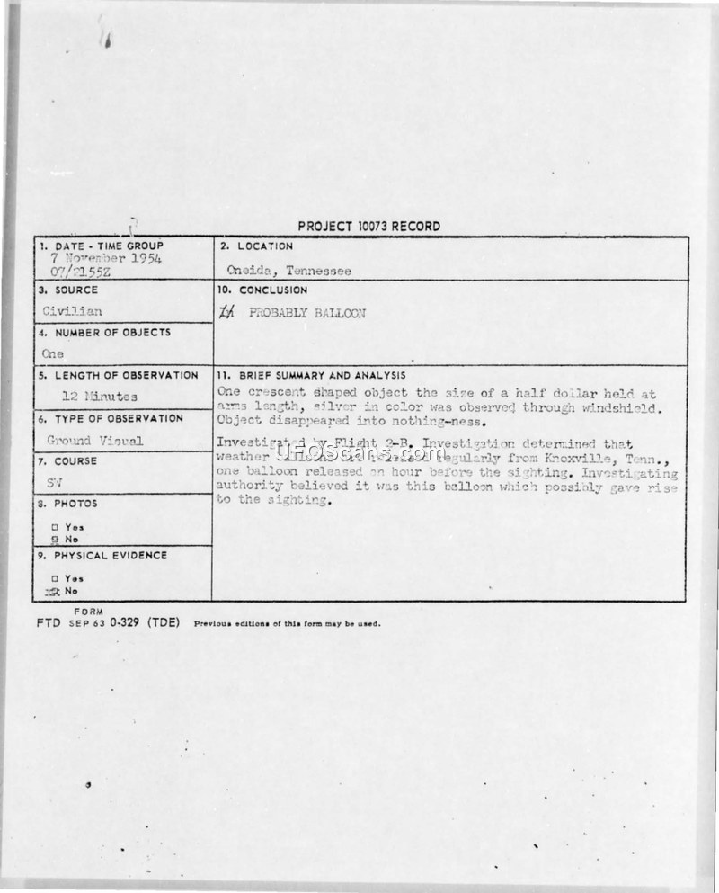 Project 10073 Record — Oneida, Tennessee, 7 November 1954