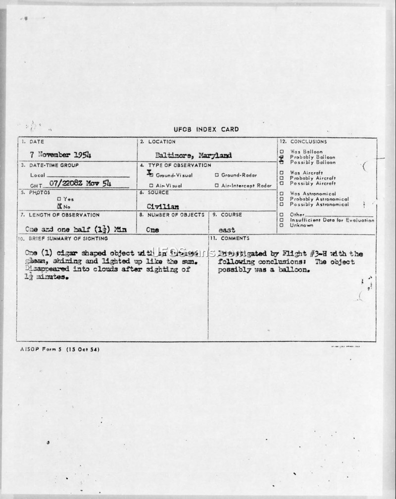 A 1954 report detailing a cigar-shaped UFO sighting near Baltimore by two reliable witnesses. The Air Force investigation concluded the object was likely a balloon.