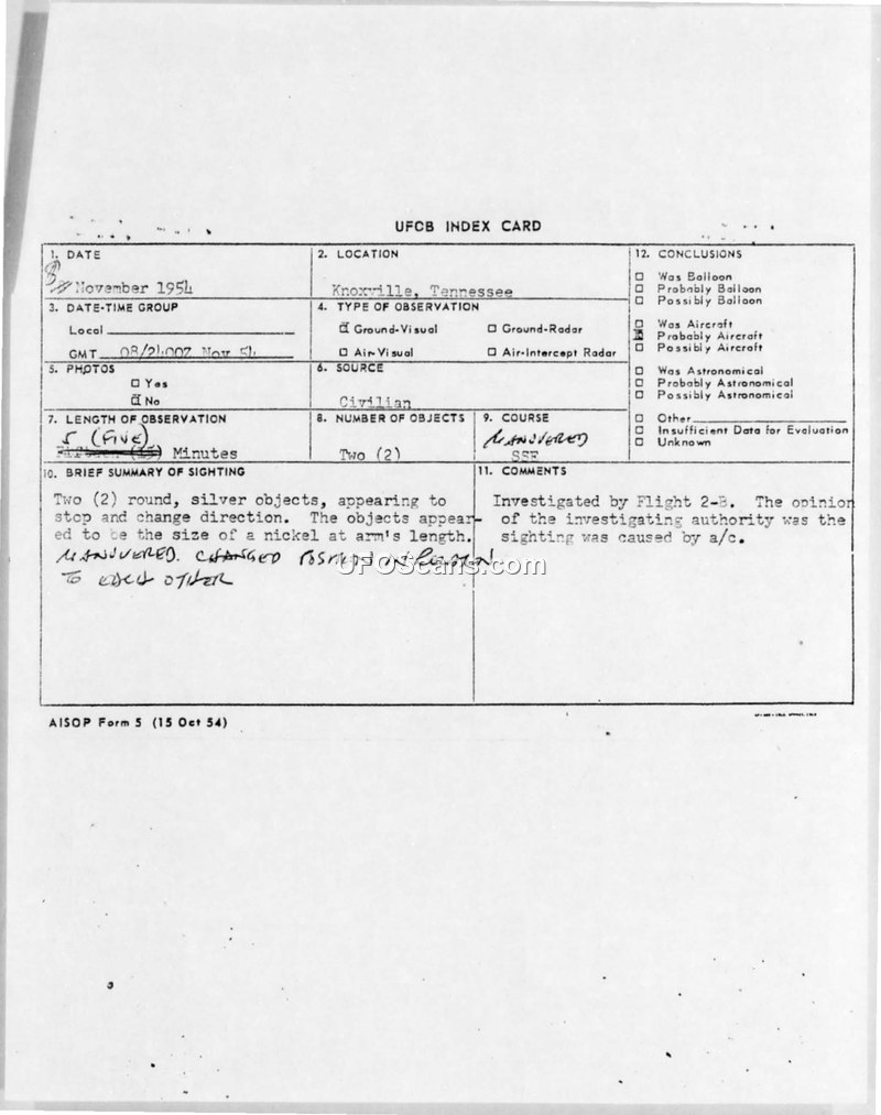 A civilian witness reported two silver, round objects maneuvering near Knoxville, Tennessee, on November 8, 1954. Air Force intelligence investigators concluded the objects were likely aircraft.