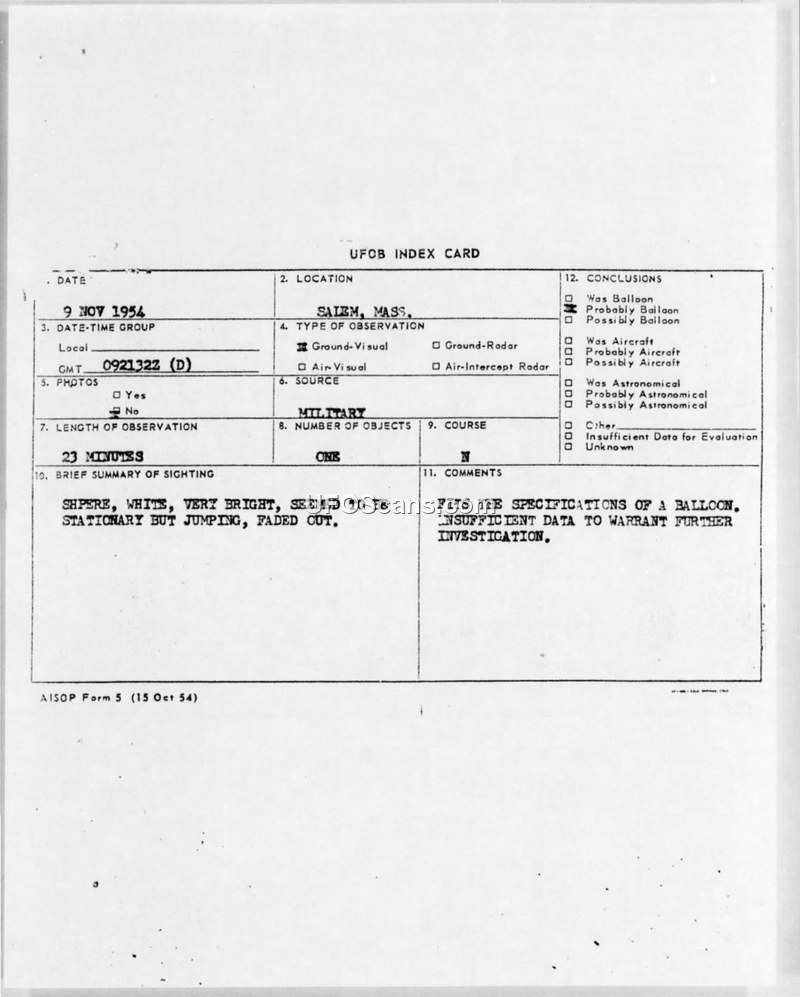 UFO Index Card — Salem, Mass., 9 Nov 1954