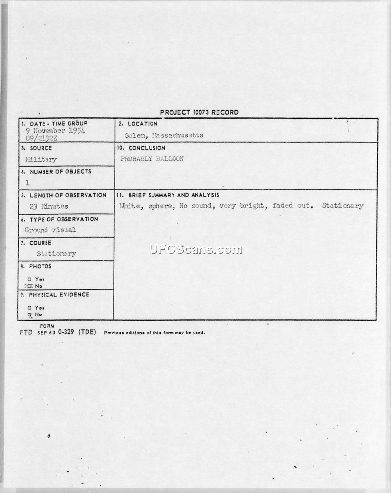 PROJECT 10073 RECORD - Salem, Massachusetts - 9 November 1954