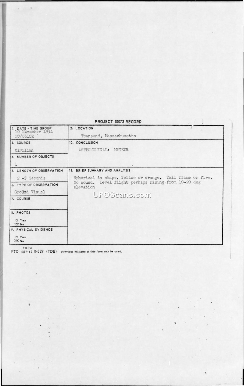 Project 10073 Record — Townsend, Massachusetts, 10 November 1954