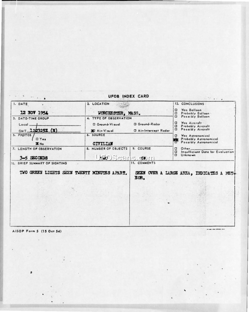 UFOB Index Card and Related Correspondence — Worcester, Massachusetts, November 1954