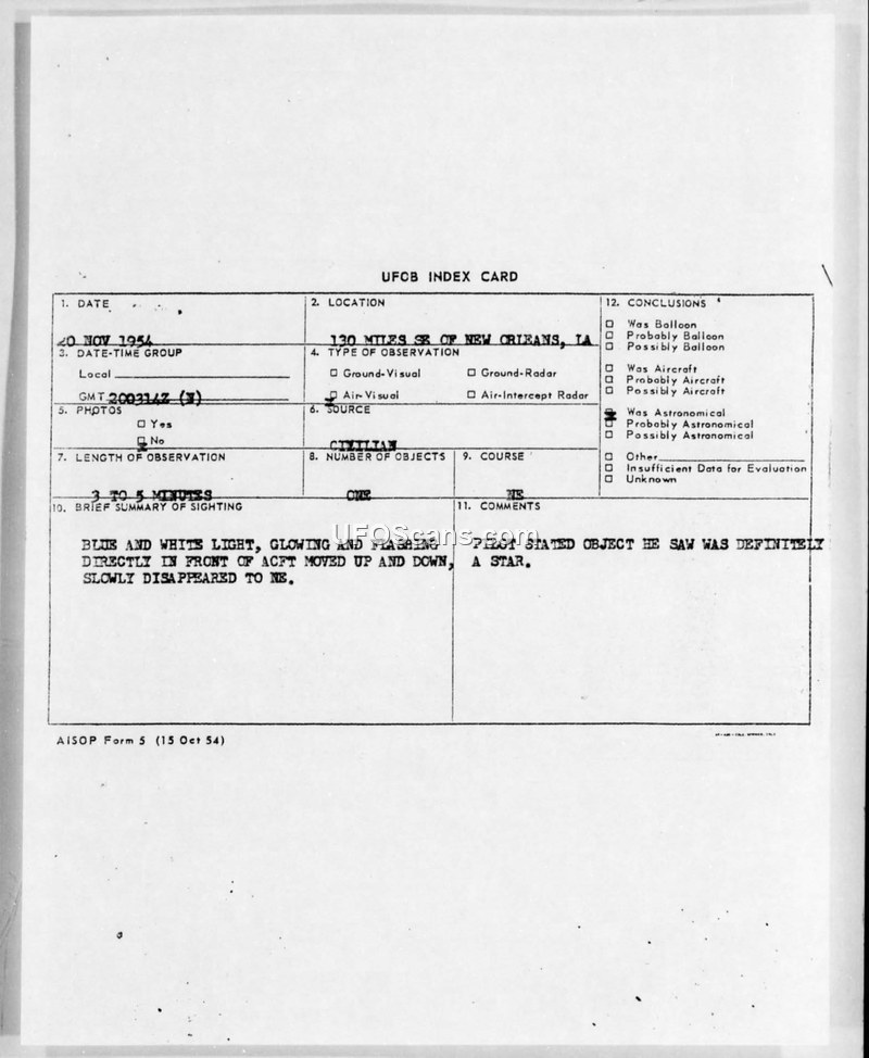 This document collection details a UFO sighting report from 20 November 1954, involving a pilot flying aircraft N918. The pilot reported observing a blue and white light that was glowing and flashing, which moved up and down before slowly disappearing. The duration of the observation was estimated at three to five minutes. The incident occurred 130 miles southeast of New Orleans, Louisiana. Following the report, the pilot was questioned via telephone by an operations dispatcher at Miami AFB. The pilot ultimately stated that the object he had seen was definitely a star. The documentation includes a UFOB Index Card and several teletype messages between various military installations, including Maxwell Flight Service Center, Air Technical Intelligence Center (ATIC), and the 34th Air Division. Internal communications indicate that the duty operations officer at the Maxwell Flight Service Center was unable to provide a definitive cause for the sighting. A separate intelligence assessment considered the possibility that the object was a naval aircraft from the Key West Naval Station, but this was dismissed as an improbable threat to the United States. The records reflect the standard military procedure for handling such reports during the period, involving cross-referencing with other reports and verifying witness accounts through follow-up questioning.