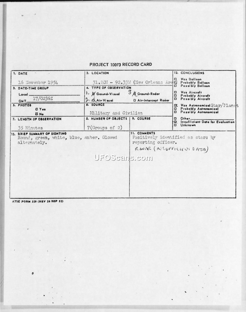A 1954 Project 10073 record card documenting a 35-minute sighting of seven objects in the New Orleans area. The objects were officially identified as stars by the reporting officer.