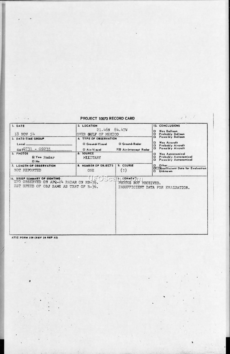 An RB-36 aircraft detected an unidentified object on its APQ-24 radar over the Gulf of Mexico on November 18, 1954. The object matched the speed of the aircraft, but the case was closed as having insufficient data for evaluation.