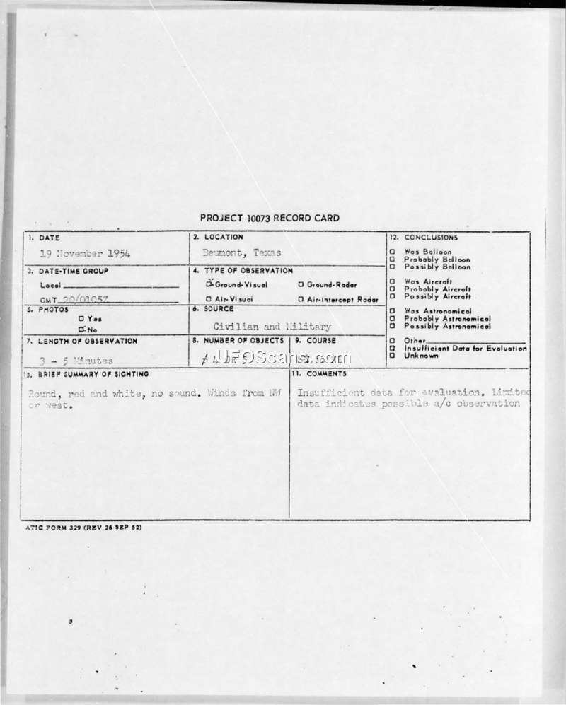 This document is a Project 10073 Record Card documenting an unidentified aerial phenomenon sighting that occurred on 19 November 1954 in Beaumont, Texas. The report indicates that the observation was made by both civilian and military sources. The witnesses reported seeing four or five round objects that were red and white in color. The objects were observed for a duration of three to five minutes, during which they traveled from the southeast to the northeast. The witnesses reported that the objects made no sound. The weather conditions at the time were noted as having winds from the northwest or west. The record card explicitly states that no photographs were taken and there was no radar contact associated with the event. The final conclusion recorded on the card is that there was insufficient data for a full evaluation, although the limited information available suggested the possibility that the objects were aircraft. The document is an ATIC Form 329, revised in September 1952.