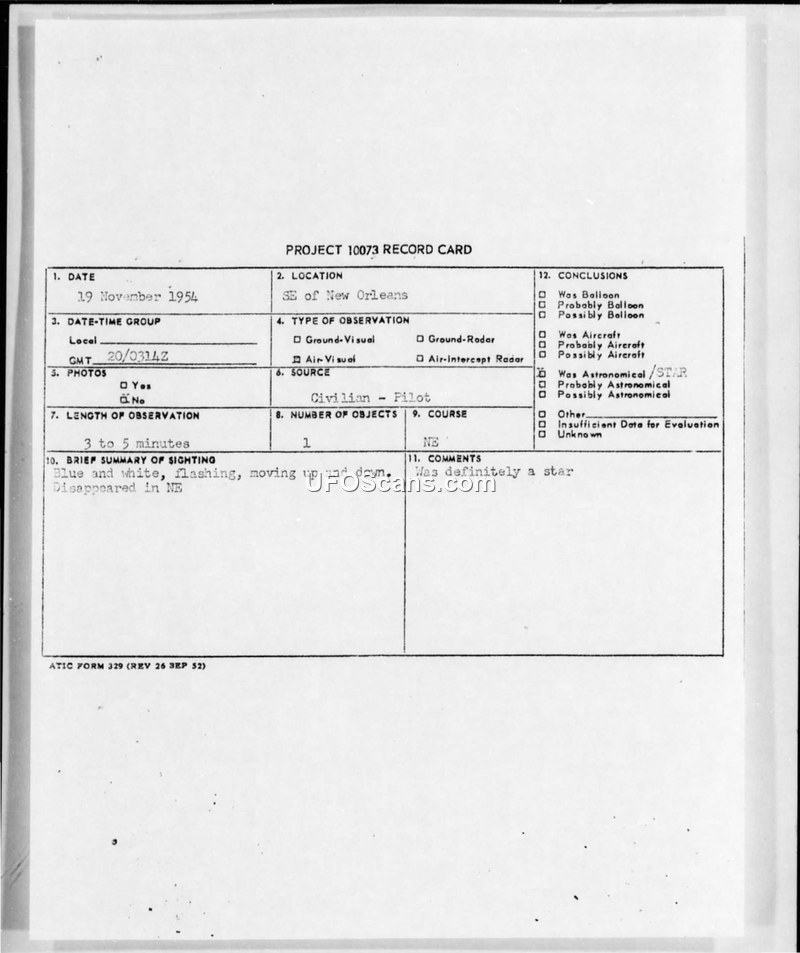 A civilian pilot reported a flashing blue and white object southeast of New Orleans on November 19, 1954. The official conclusion of the investigation was that the object was a star.