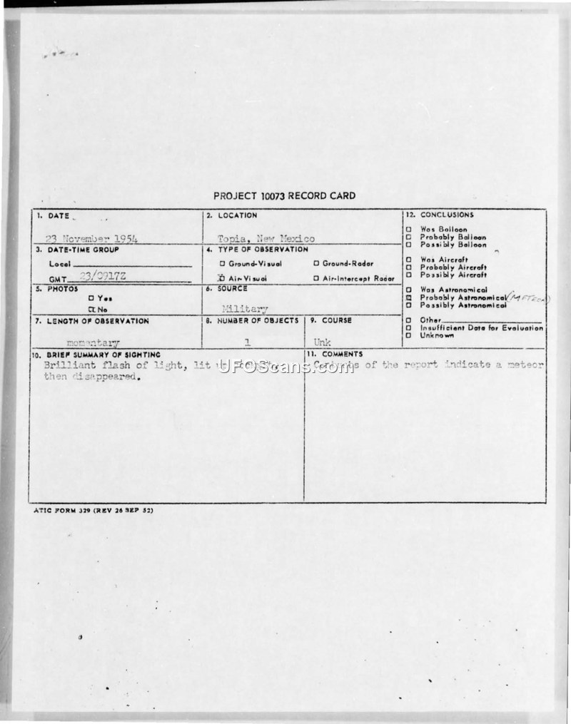 A Project 10073 record card documenting a momentary sighting of a brilliant flash of light in Topia, New Mexico, on 23 November 1954. The event was officially attributed to a meteor.