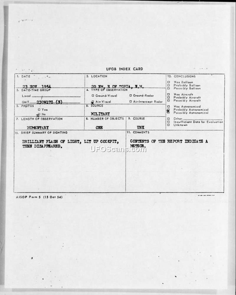 A pilot reported a brilliant flash of light near Topia, New Mexico, on November 23, 1954. The Air Technical Intelligence Center concluded the event was a meteor.