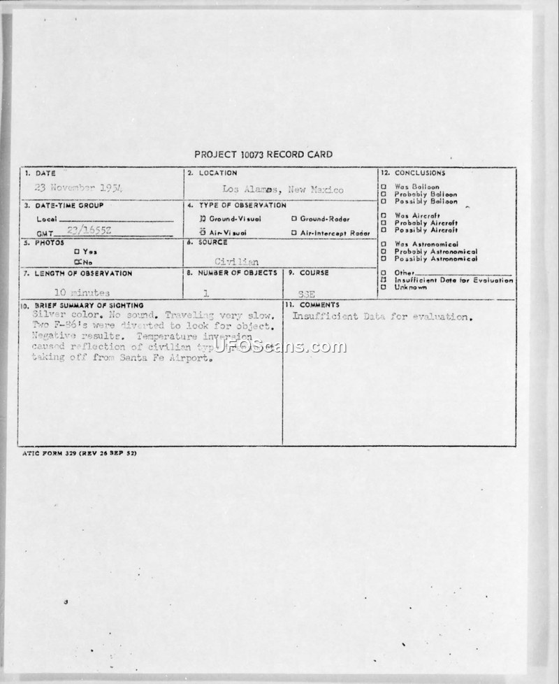 On the morning of 23 November 1954, at 1655Z, a single unidentified object was observed near Los Alamos, New Mexico. The sighting was reported by two individuals: a pilot employed by CARCO Airlines and a control tower technician stationed at Los Alamos. The object was described as silver in color, exhibiting no trail or exhaust, and moving at a slow speed estimated between sixty and one hundred knots. The observers noted that the object made no audible sound. The duration of the observation was approximately ten minutes, during which the object maintained a heading of south-southeast before disappearing over a hill near Santa Fe, New Mexico. In response to the report, two F-86 aircraft were diverted to investigate the area, but their search yielded negative results. The official assessment provided by Captain Charles L. Demers of the 34th Air Division (Defense) concluded that the sighting was likely an optical phenomenon. Specifically, it was determined that a temperature inversion in the atmosphere caused a reflection of a civilian transport aircraft taking off from the Santa Fe Airport. The report notes that there was no other air traffic in the area at the time that could account for the sighting, and no physical evidence was recovered. The documentation includes a Project 10073 record card and a supplement to Air Force Form 112a, detailing weather conditions, observer information, and the final intelligence evaluation.