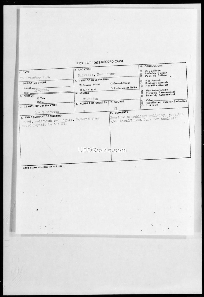 This document is a Project 10073 record card detailing a sighting that occurred on November 26, 1954, in Milville, New Jersey. The report indicates that a civilian witness observed four round, yellowish-red lights for a duration of two to three minutes. According to the record, the objects were observed to hover before moving rapidly in a northeasterly direction. The observation was classified as a visual sighting, with no radar contact or photographic evidence reported. The official conclusion recorded on the card suggests that the phenomenon may have been caused by searchlight activity or an aircraft, but ultimately notes that there was insufficient data for a definitive analysis.
