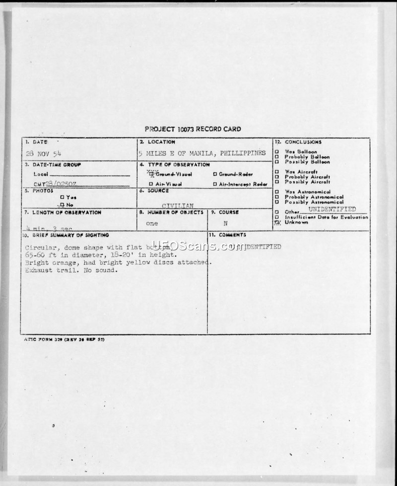 A medical doctor in Manila reported a 4-minute sighting of a circular, dome-shaped object with yellow discs and an exhaust trail on 28 November 1954. The USAF investigation concluded the object remained unidentified.