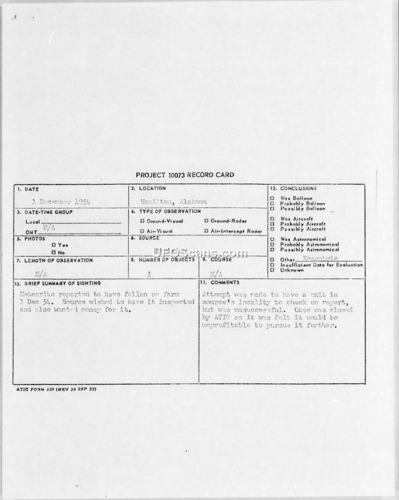 This document collection details the administrative handling of a report concerning a potential meteorite impact on a farm in Hamilton, Alabama, on December 1, 1954. The civilian source reported that the object created a hole in the earth measuring 9 feet wide, 4 feet deep, and 52 feet long. The source requested an inspection of the site and sought financial compensation for the event. The Air Technical Intelligence Center (ATIC) initially attempted to coordinate an investigation through Maxwell Air Force Base. However, internal correspondence from May 1959 reveals significant logistical difficulties in conducting the investigation. Colonel Leslie M. Norton of Maxwell Air Force Base informed ATIC that his staff was over 200 miles away from the site and was fully occupied with high-priority projects, making an on-site investigation impossible. Furthermore, the source did not possess a telephone, complicating communication. Consequently, ATIC relieved Maxwell Air Force Base of the responsibility for the investigation, and the case was officially closed with the conclusion of 'Insufficient Data for Evaluation,' as it was deemed unprofitable to pursue further.