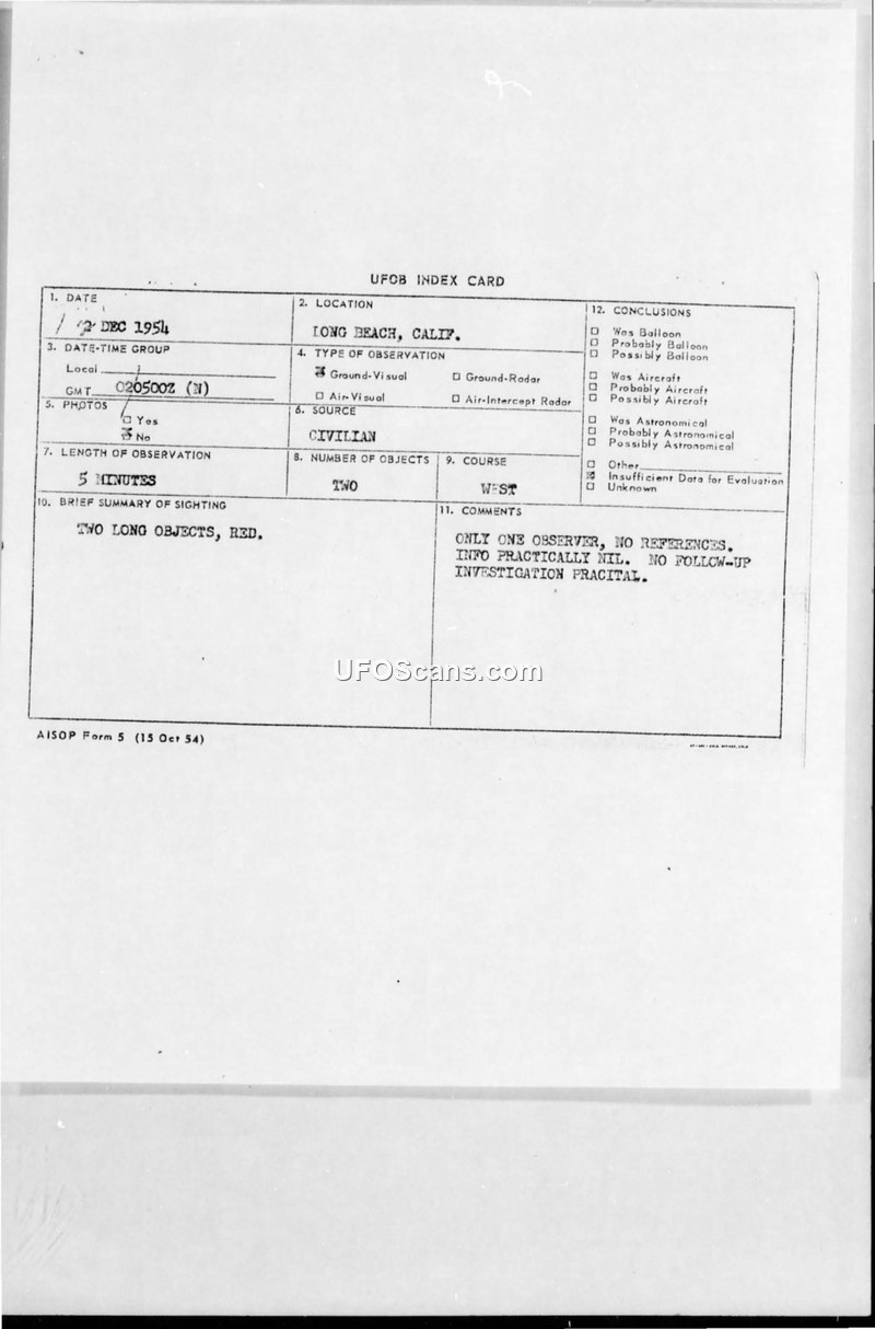Both sightings were reported by civilians in Long Beach, California, in December 1954. The first involved two red, long objects moving west for five minutes. The second involved a round blue light moving at an estimated 200 knots at a very high altitude for 15 minutes. In both cases, investigators noted a lack of information and references, concluding that follow-up was not practical.
