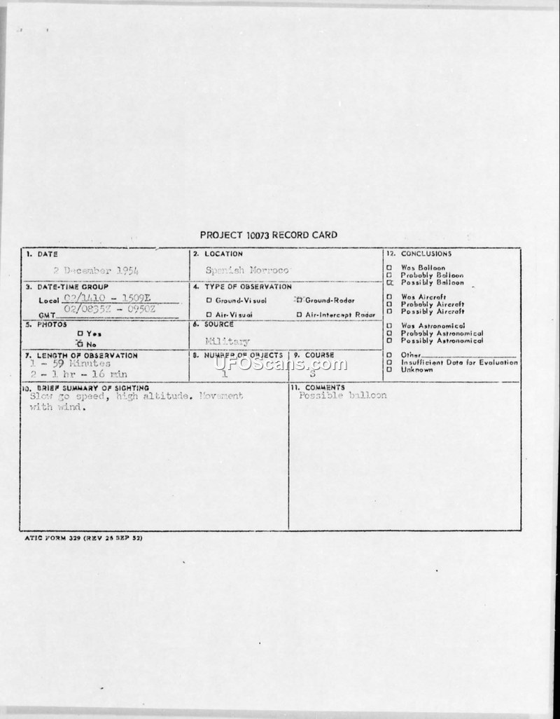 This document is a Project 10073 record card and associated teletype report detailing an unidentified aerial phenomenon observed on 2 December 1954 over Spanish Morocco. The object was detected by ground radar (MPS-7 and TPS-10D) and tracked for approximately one hour and sixteen minutes. The sighting was reported by 2nd Lt. George C. Dyer, a senior director with the 735th ACW Squadron, who described the object as maintaining a slow speed at a high altitude of 58,000 feet, moving with the wind. The report notes that the object was tracked at various altitudes and speeds, including a descent to 6,000 feet before fading from radar. Weather conditions were reported as CAVU (Ceiling and Visibility Unlimited). The official conclusion reached by the investigating authorities was that the object was a possible meteorological balloon, noting that research into potential balloon launches in the area was conducted. The report also mentions that an aircraft was scrambled to intercept the object but reported 'no joy.' The document is marked as unclassified and includes technical details regarding the radar tracking and the flight path of the object.