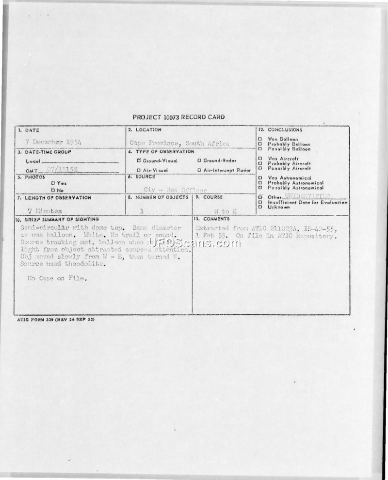 This document is a Project 10073 Record Card detailing an unidentified aerial phenomenon sighting that occurred on December 7, 1954, in Cape Province, South Africa. The report indicates that a weather officer observed a single object for a duration of seven minutes. The object was described as semi-circular with a dome top, white in color, and possessing a diameter comparable to a weather balloon. The observer noted that the object produced no trail or sound, and its presence was initially detected when it reflected light. The observer utilized a theodolite to track the object as it moved slowly from west to east before executing a turn to the north. The record card notes that there were no photographs taken and no radar contact made. The document indicates that the information was extracted from ATIC report 211023A, IR-42-55, dated February 1, 1955, and is held in the ATIC repository. The final assessment on the card indicates that there is no case file associated with this incident.