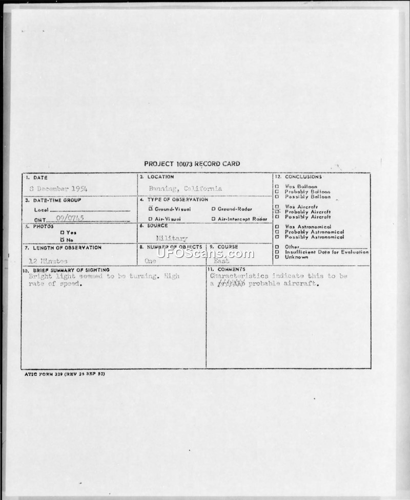 Project 10073 Record Card — Banning, California, 8 December 1954