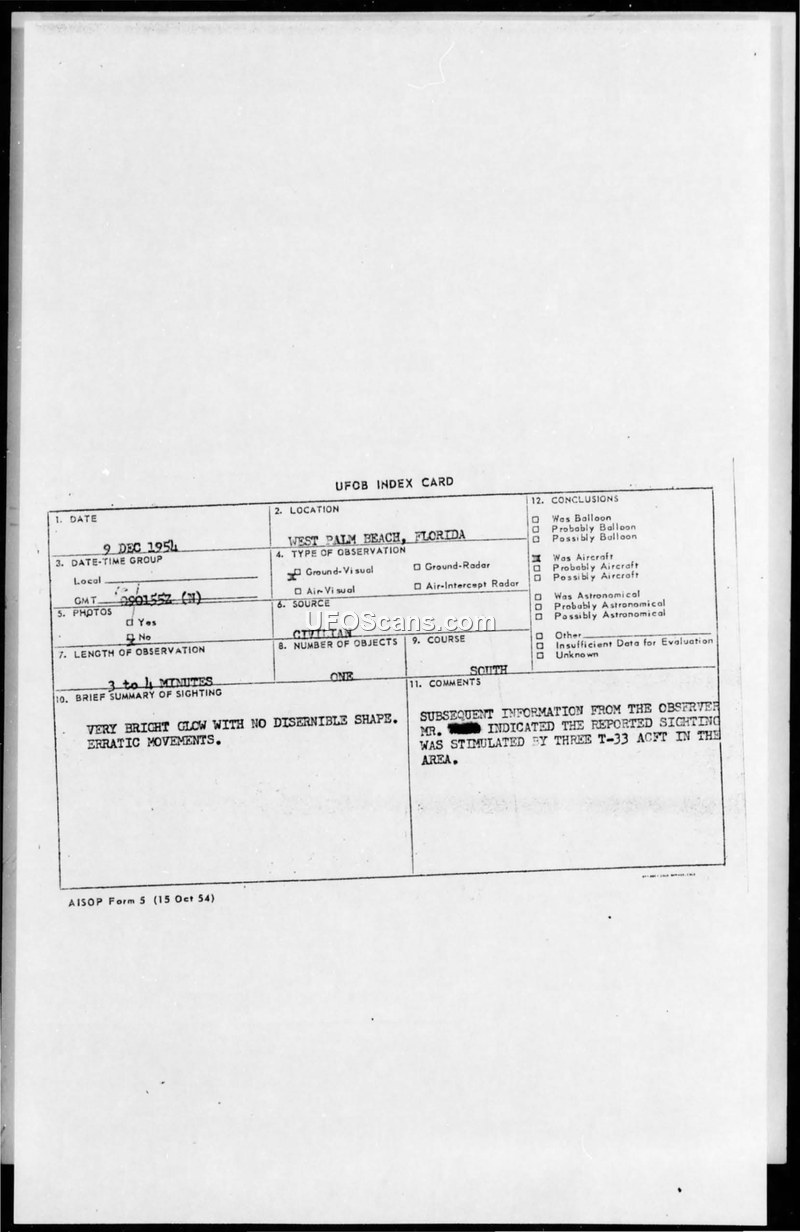 UFOB Index Card — West Palm Beach, Florida, 9 Dec 1954