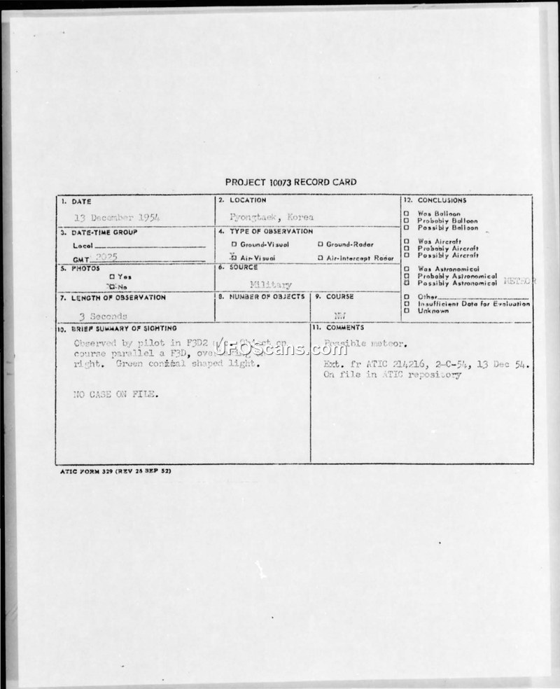 Project 10073 Record Card — 13 December 1954, Pyongtaek, Korea