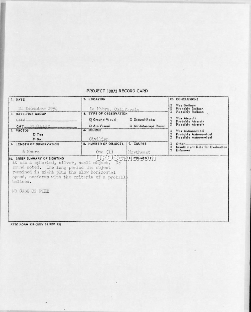 A Project 10073 record card documenting a six-hour sighting of a silver, spherical object in La Habra, California, on December 21, 1954. The object was officially classified as a probable balloon.