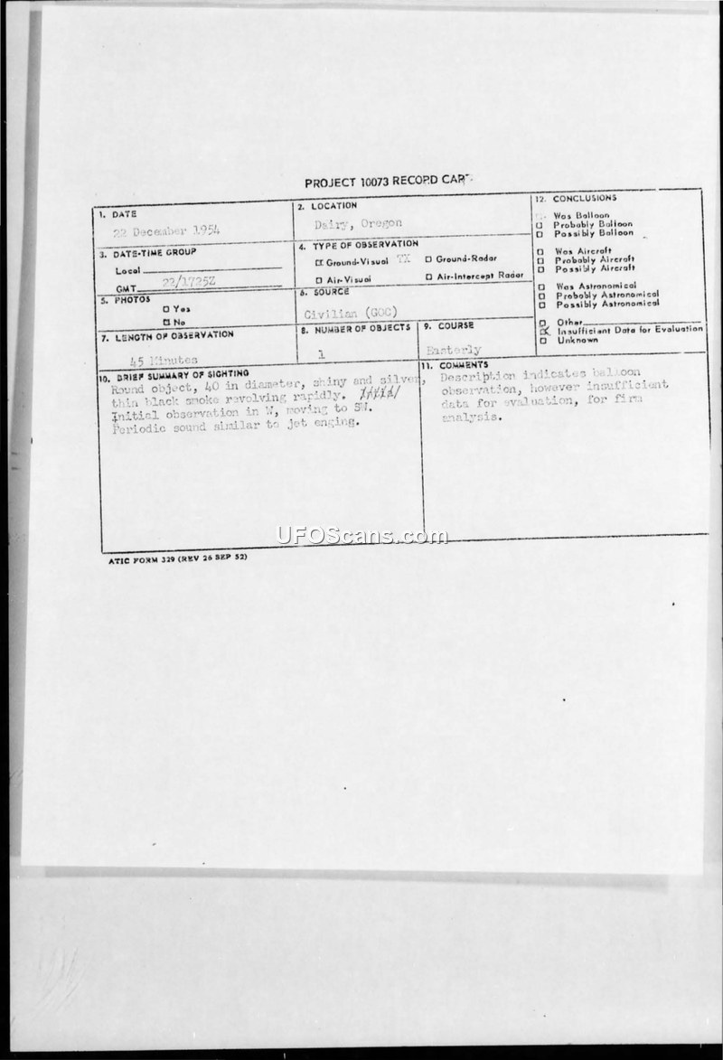 Project 10073 Record Card — Dairy, Oregon, 22 December 1954