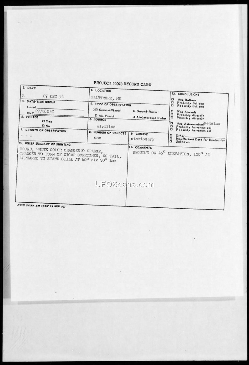 A 1954 sighting report from Baltimore, Maryland, describes a stationary, color-changing object. The military investigation concluded the object was the star Regulus.