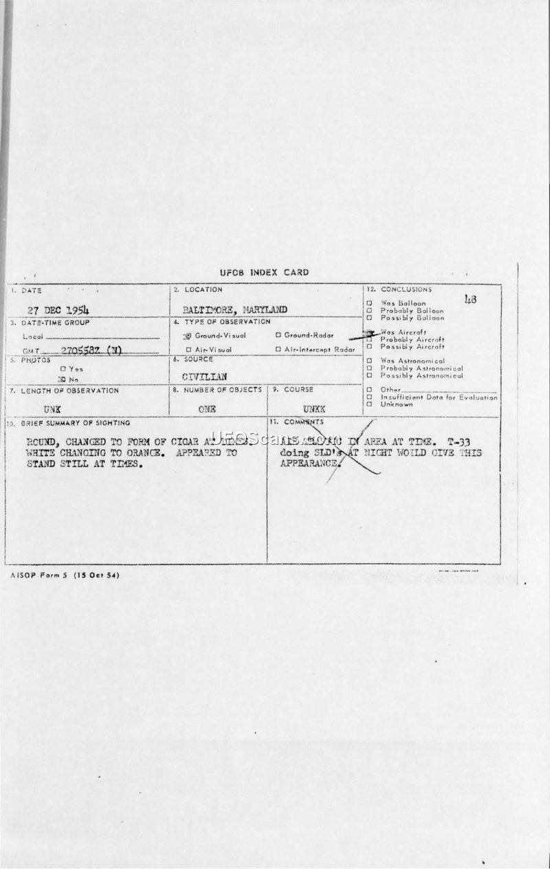 A 1954 sighting report from Baltimore, Maryland, describes a round, color-changing object. The military concluded the sighting was likely a T-33 aircraft performing night maneuvers.