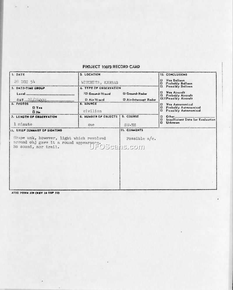 A civilian in Wichita, Kansas, reported a one-minute sighting of a revolving light on December 28, 1954. The official conclusion recorded on the Project 10073 card is that the object was a possible aircraft.