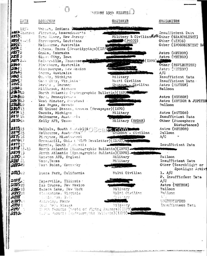 A chronological log of UAP sightings from 1954, detailing locations, observers, and official evaluations. The document highlights the variety of explanations used by investigators, including astronomical, meteorological, and conventional aircraft, while noting many cases remained unidentified or had insufficient data.