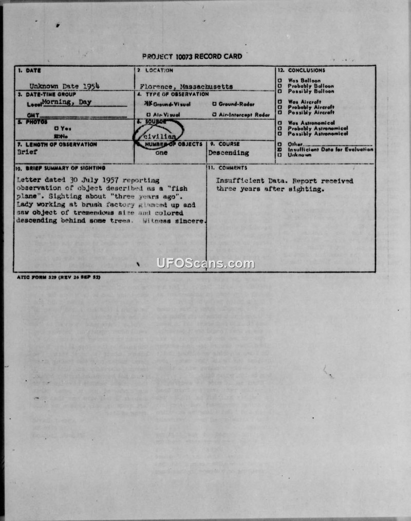A 1954 sighting of a 'fish plane' object in Florence, Massachusetts, was reported to the Navy in 1957. The Navy referred the report to the Air Force, which concluded there was insufficient data for evaluation.