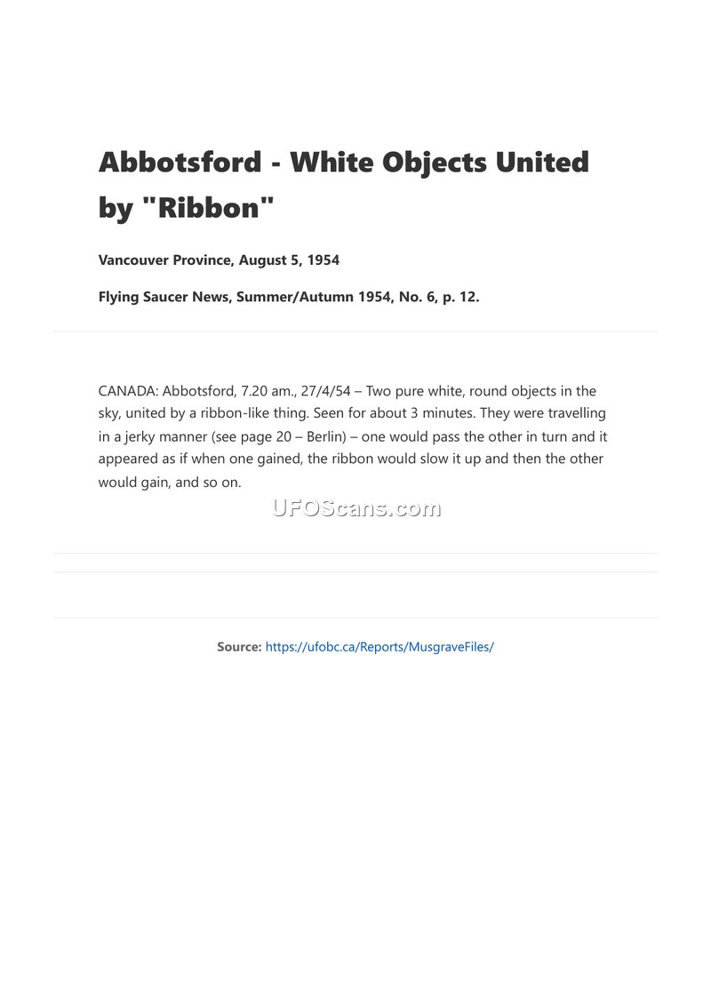 This document is a brief report of a 1954 sighting in Abbotsford, Canada, involving two white, round objects connected by a ribbon. It is significant for its description of the objects' unique, jerky, and tethered flight behavior.