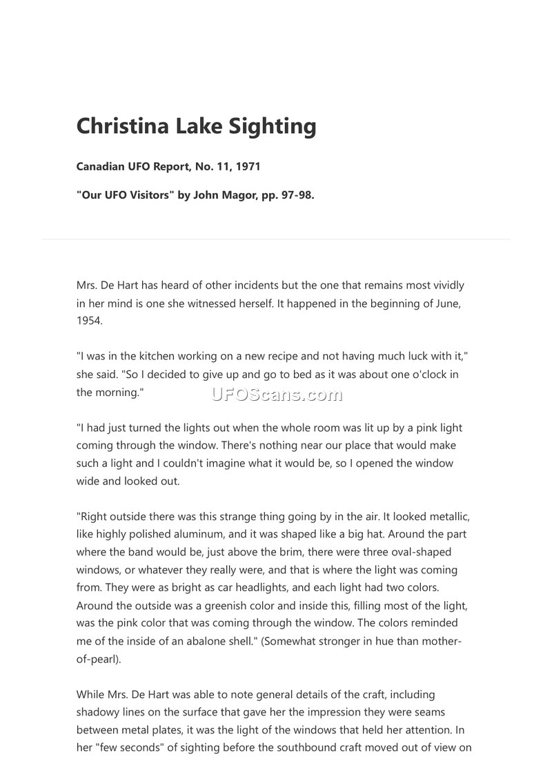 This document details a 1954 UFO sighting by Mrs. De Hart at Christina Lake, Canada. The witness describes a metallic, hat-shaped craft with undulating motion and audible chime-like sounds.