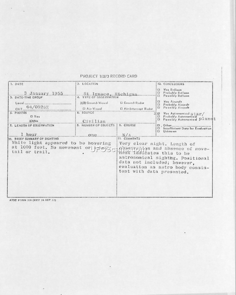 A civilian in St. Ignace, Michigan, reported a stationary white light on January 3, 1955. The Air Force concluded the object was an astronomical star or planet.