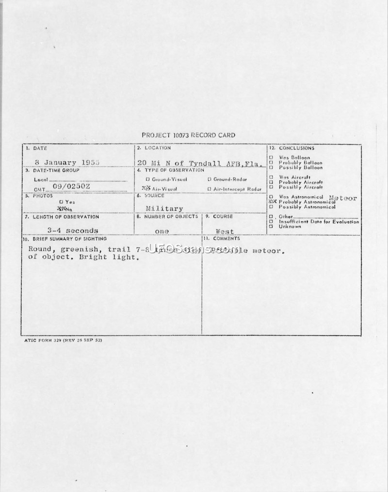 A sighting of a bright, greenish, round object with a trail occurred near Tyndall AFB on 8 January 1955. Military and civilian witnesses reported the event, which was officially concluded to be a meteor.