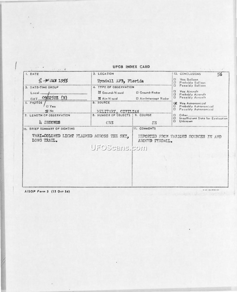 A 1955 sighting report from Tyndall AFB describing a vari-colored object with a long trail. The event was officially classified as an astronomical phenomenon.