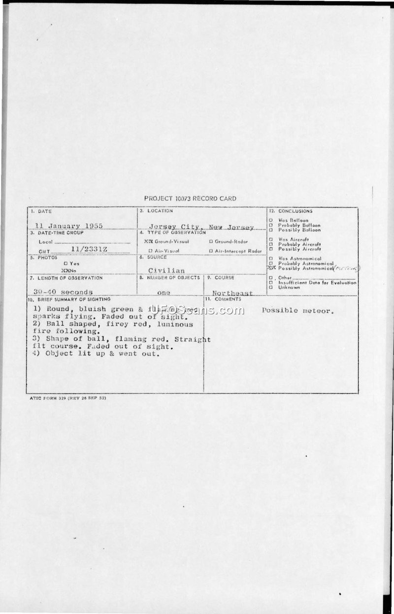 A sighting of a luminous, ball-shaped object in Jersey City on 11 January 1955 was investigated by the Air Technical Intelligence Center. The official conclusion reached was that the object was likely a meteor.