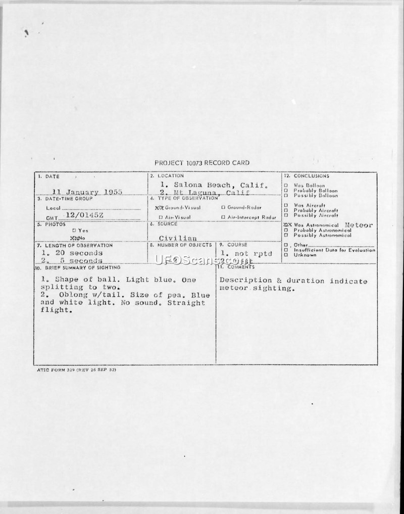 PROJECT 10073 RECORD CARD — 11 January 1955, Salona Beach, Calif.