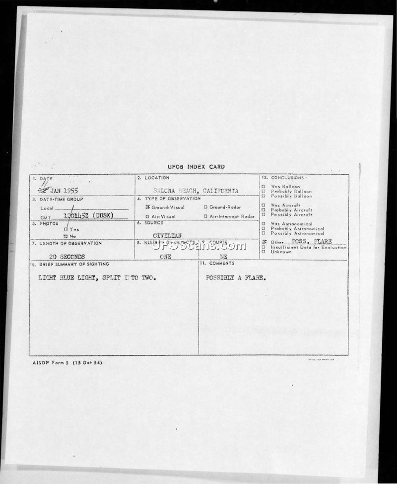A 1955 sighting report from Salona Beach, California, describes a blue and white light that split into two. The military investigation concluded the object was likely a flare.