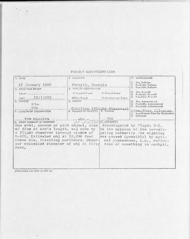 This Air Intelligence Information Report details a UFO sighting reported by R.P. Colgan, a flight electronics engineer with the Lockheed Aircraft Corporation, on 12 January 1955. While flying as an observer on a B-47 aircraft at 20,000 feet, approximately 30 miles southeast of Atlanta, Georgia, Colgan observed an oval-shaped object with a chrome lustre that appeared to change to a pink hue. He estimated the object to be 50 feet in diameter and traveling at 350 knots. The object was observed for approximately two minutes before it accelerated and disappeared from sight. Colgan reported the sighting to the 35th Air Division at Dobbins Air Force Base. The subsequent investigation involved checking with local weather stations, the Ground Observer Corps, and the Atlanta Control Tower to rule out balloons, aircraft, or other conventional explanations. No radar contact was reported by the electronics engineer at the Atlanta Municipal Airport. The investigating officer, M/Sgt Carl G. Schuller, and the approving officer, First Lieutenant Richard C. Vaughn, concluded that the sighting was likely an optical illusion caused by reflections within the cockpit. This conclusion was supported by the fact that no other crew members on the B-47 observed the object and that the observer's size estimates were mathematically inconsistent. The report includes a statement from the observer and a memory sketch of the flight pattern.