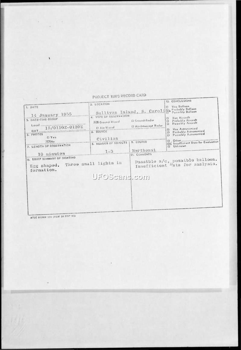 A civilian reported an egg-shaped object and lights in formation over Sullivan Island, South Carolina, on 14 January 1955. The Air Technical Intelligence Center concluded the event provided insufficient data for analysis.