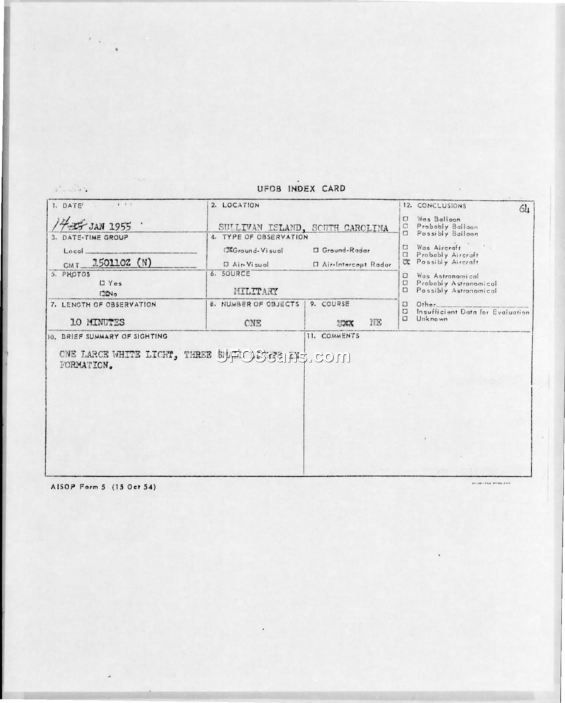 This document is a UFOB Index Card recording an aerial sighting that occurred on January 17, 1955, at Sullivan Island, South Carolina. The sighting, which lasted for a duration of 10 minutes, was reported by a military source. The observer described the phenomenon as consisting of one large white light accompanied by three smaller lights, which were observed moving in formation. The course of the objects was noted as NE. The index card indicates that no photographs were taken and there was no radar contact associated with the event. The document, identified as AISOP Form 5 (dated 15 Oct 54), provides a structured summary of the incident but does not contain a final official conclusion or explanation regarding the nature of the lights.