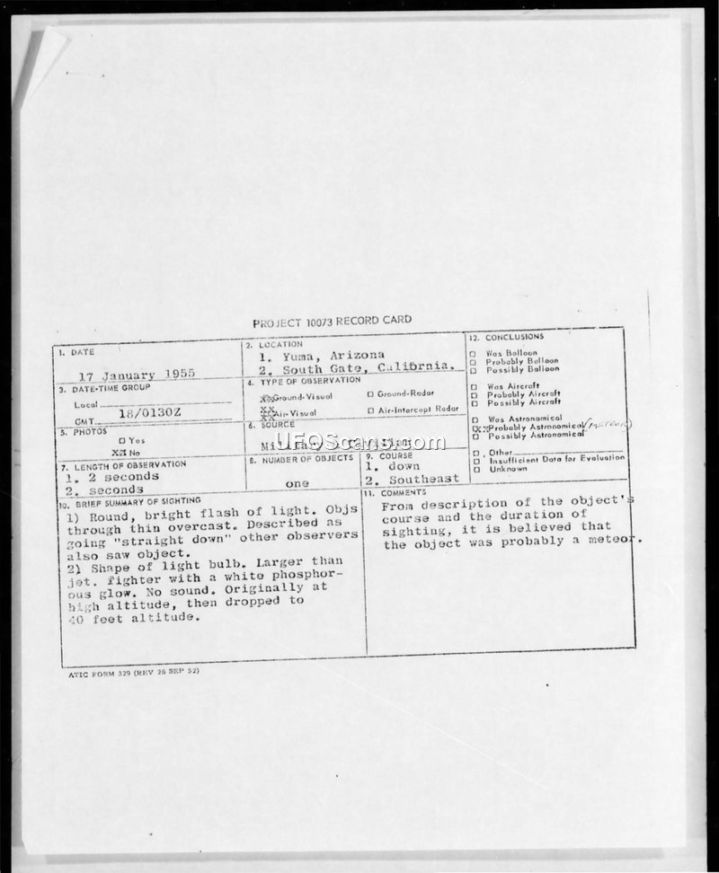 On 17 January 1955, multiple witnesses observed a bright, light-bulb-shaped object with a fire trail descend rapidly over Arizona and California. Military intelligence investigated the incident and concluded the object was likely a meteor.