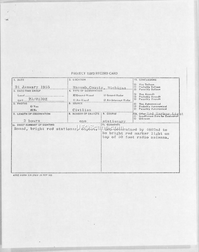 A civilian reported a stationary red UFO in Macomb County, Michigan, in 1955. Military investigators from the 4602d AISS identified the object as a red marker light on a radio antenna.