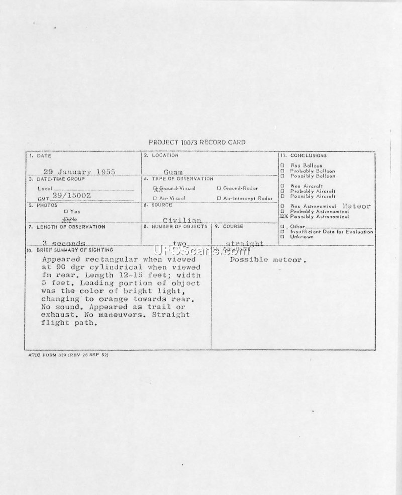 This document is an Air Intelligence Information Report (SAC IR-3-55) detailing a sighting of an unidentified flying object over Guam on January 29, 1955. The report includes a Project 10073 record card and correspondence from the Headquarters Strategic Air Command at Offutt Air Force Base to the Air Technical Intelligence Center at Wright-Patterson Air Force Base. Two witnesses, both Civil Service employees with prior military experience, reported seeing two objects with a straight flight path for a duration of three seconds. The objects were described as rectangular when viewed at 90 degrees and cylindrical when viewed from the rear, measuring 12-15 feet in length and 5 feet in width. The leading portion of the object was described as a bright light, changing to orange towards the rear. No sound or maneuvers were observed. The witnesses were fishing in a small harbor at the time of the sighting. The official conclusion reached by the intelligence officers was that the objects were a 'possible meteor.' The report notes that while the observers' accounts were considered somewhat questionable due to the short duration of the sighting, there was no evidence of fabrication or exaggeration. Furthermore, checks with local AACS and Control Tower agencies yielded no evidence of scheduled aircraft or weather phenomena that could explain the sighting.